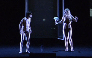 ところが、今回のシュテファン・ヘアハイムの演出には、「後宮」も「誘拐」も、そして「逃走」も出てこないというとんでもないことが起こっていました。そもそも、序曲の中間部でゆっくりした音楽が流れ始めたとき、ステージ上には全裸の男女が現れたのですから喜ん・・・いや、驚いてしまいました。その男女は、堂々と登場した割りには意気地がありません。いきなり恥ずかしそうに前を隠し始めました。もしかしたらエデンの園が入っているのかと思ってしまいましたが、それは見当外れ、男は慌てて前に置いてあったパンツを履いてとても気になる物を隠したかと思うと、燕尾服を着始めたのです。女の方もウェディングドレスで豊満な胸を覆ってしまいましたよ。そう、そこに現れたのは、結婚式を控えたカップル、しかもそれが10組以上ステージに登場したのです。