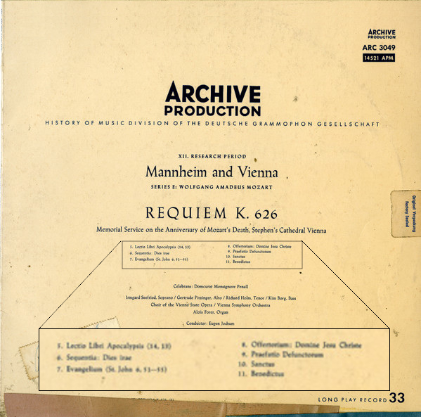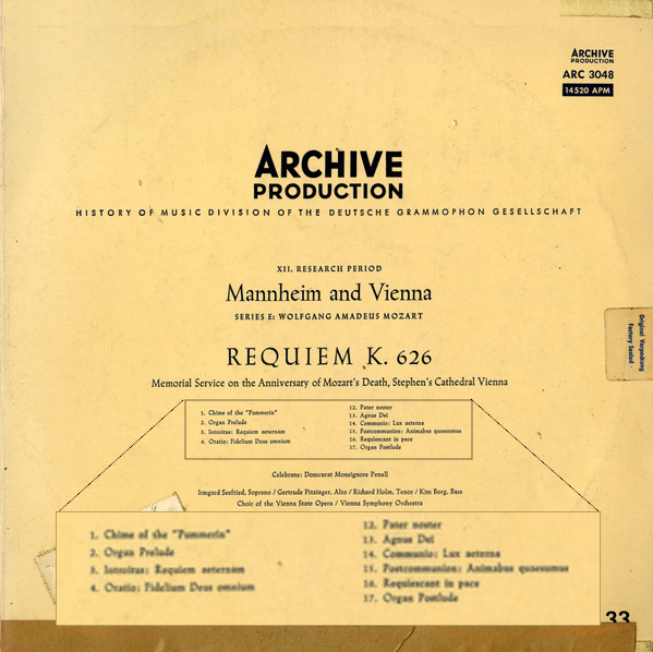 それは、「第1研究部門」の「グレゴリオ聖歌」から始まって、最後は「第12研究部門」の「マンハイムとウィーン」まであるのですが、その中の最後の「Eシリーズ」というのが、「モーツァルト」なんですよ。バッハなどは「第9研究部門」になっていて、その中は「A」の「カンタータ」から「M」の「音楽の捧げものとフーガの技法」までの12(「J」を除く)のセクションに分かれています。 まあ、この時代ですから、バッハあたりの演奏にはまだモダン楽器が使われていて、それほど「学術的」ではなかったのですが、当時はマジで圧倒されましたね。ですから、そこに「モーツァルト」まで入っていたなんて、気づきませんでした。 おそらく、今でもこのレーベル自体は存在しているのでしょうが、もはや「研究部門」といった文字はどこにも見当たらない、DGと一緒のUNIVERSALの中の1レーベルになってしまっているようですね。 これは1955年12月2日に、ウィーンの聖シュテファン大聖堂で行われた、モーツァルトの命日(本当は12月5日)の礼拝で行われた演奏をライブ録音したものです。もちろんモノラルです。真面目なんですね(それは「モラル」。 なんと言っても、これは「典礼」のライブ録音ですから、ただ曲を演奏するだけではなく、その前後に典礼ならではのパフォーマンスが入っているのが、そのまま録音されています。 まずは、演奏が入る前の「客入れ」の段階から録音は始まっていて、かなり騒々しい入場者の話し声に交じって、オルガンが「レクイエム」の最初のテーマを演奏しているのが聴こえてきます。その間には、なにかの合図なのでしょうか、鐘の音も聴こえます。そして、「レクイエム」が始まります。前奏に続いて合唱が入ってくると、なんだか女声がかなり上ずった声で歌っているような不快感が募ります。なんか、力が入りすぎているような。そこに、ソプラノ・ソロのゼ―フリートが入ってくると、やっと「音楽」らしくなります。彼女の声はとてもまろやかで、安らぎに満ちていました。 それからも、合唱がやたらと乱暴な歌い方をしているのがかなり耳障りですが、それとは対照的にソリスト陣が充実しているので、救われます。キム・ボルイなどという、昔好きだったバス歌手なども、素敵でしたね。 曲の間には、グレゴリオ聖歌が入ります。さらに、真ん中あたりと、曲が全部終わった後に、オルガンの即興演奏も入っています。 オリジナルは2枚組のLPです。そして、その中にはこのレーベルの売り物、「カルテ」というデータ表が入っています。それがこの画像です。 ![]() ついでに、そのジャケットには、曲順が表記されています。その部分だけ拡大してみました。 ![]() ![]() ![]() Album Artwork © Deutsche Grammophone GmbH |