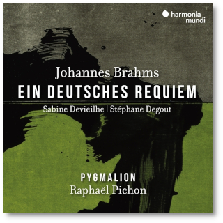 さらに、その「死者を悼む」という概念を拡大解釈して、すべて別な歌詞で、時には宗教的な意味すらも全くなくしてしまった作品もたくさんあります。もっと言えば、武満徹の「弦楽のためのレクイエム」などでは、声楽のパートすらなくなっています。 ブラームスの「ドイツ・レクイエム」についても、正統的な「レクイエム」に慣れ親しんだものとしては、なにか世界が違う、という印象は免れませんでした。これまで幾度となくこの曲を聴いてきたにもかかわらず、そこにはちょっと入って行きづらい世界があったのですね。 確かに、ブラームス自身も、これが従来の「レクイエム」とは別物なのだ、という意識はあったのでしょう。そもそもタイトルからして「Ein deutsches Requiem」という、頭に定冠詞の「Das」ではなく不定冠詞の「Ein」を付けた、「いわゆる一つの、ドイツ語によるレクイエム」みたいな、あまり「断定」されていないような感じのする弱気なものなのですからね。 もちろん、そのテキストは、オリジナルのラテン語をそのままドイツ語に訳したものなどでは全くなく、ブラームス自身が聖書やそのほかの聖典から選んだフレーズを集めたものです。 そして、ブラームスは、これを作り上げるまでには構想から10年以上かかっていますから、それなりの苦労もあったのでしょうね。 ところが、これまでバッハやモーツァルト、そしてモンテヴェルディなどを聴いてすっかりファンになってしまったピションとピグマリオンのチームがこの曲を録音したというので聴いてみたのですが、予想通り、そこにはそのようなこれまでの先入観を完全に覆すものがあったのでした。 まずは、オーケストラの楽器がピリオド楽器だ、という点で、すでに曲全体の音色がガラリと変わっています。ヴァイオリンが参加しない1曲目の冒頭では、本当に聴こえるか聴こえないかというレベルで録音されているチェロの最初のフレーズが完璧なノン・ビブラートで歌われると、それだけで従来のこの曲の演奏とはガラリと異なる世界が広がります。そこにあったのは、静寂と同等の説得力を持つ音楽だったのです。 管楽器なども、ピションは独特のバランスで聴かせようとしていたのでしょう、今まではほとんど気が付かなかったようなフレーズが、とても雄弁なフレージングで語り掛けるところは数知れず。しかも、それが何とも朴訥な音色だというところにも惹かれます。 もちろん、合唱も素朴な発声で、恐るべき表現力を発揮してくれています。しかも、それが、曲によっての落差がとても大きいので、それぞれのキャラクターがよりくっきりと感じられるようになっているのですね。 この曲では、普通の「レクイエム」の中の「Dies irae」と同じような最後の審判の世界観が表現されている部分があります。それが最後から2番目、6曲目の「Denn wir haben hie keine bleibende Statt(われら地上に永遠の都を持たず)」です。ものの本によれば、これは従来の「怒りの日」とされていたものを「救いの日」に変えたものだ、ということなのですが、確かに激しく荒れ狂う金管楽器の咆哮の部分が終わると、なにか芳香が漂うホッとする音楽が現われて、まさに「救い」が感じられるのが、この演奏でははっきり分かります。 欲を言えば、そこで歌われるバリトンのソロが、ちょっとそのようなコンセプトからは離れた、かなり俗っぽい歌い方だったのが難点だったでしょうか。 ソリストはもう一人、5曲目にソプラノも登場します。この人は、とても可憐な歌い方で、この音楽にはマッチしていたようですね。 CD Artwork © harmonia mundi musique s.a.s. |