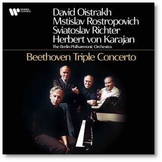 つまり、「冷戦」のさなかに、ソ連のソリストと「西側」だったドイツのオーケストラが一緒にレコーディングを行うということは、まさに「歴史的」な「事件」だったのでした。 実際の録音は、ベルリンでEMIのエンジニアによって行われ、ソ連ではMELODYA、ドイツではEMI(ELECTROLA)という、別々のレーベルからリリースされています。日本の場合は、当時のEMIの窓口だった東芝音楽工業ではなく、MELODYAのレコードを販売していた新世界レーベル(ディストリビューターはビクターエンタテインメント)から発売されていました。 もちろん、現在では東芝も新世界も、そしてEMIもなくなってしまいましたから、このようにWARNERからリリースされています。そして、この音源はLPでもSACDでもなく、デジタル配信です。 ということで、今回またこのアイテムを取り上げたのは、まず、その音質の確認をしたかったからです。以前のSACDでは、部分的にはLPをしのぐ音が聴けていましたが、それにAACがどれだけ迫れるか、ということですね。結果としては、やはりSACDに比べれば、音の繊細さや輝きに関してはいくらか劣っている面はありますが、これだけを聴いた時には、まず鑑賞の妨げにはほとんどならないのでは、という感じですね。 というか、そもそも、今ではSACDなどもほぼ絶滅していることからも分かるように、「オーディオ」というものに対する興味は、ほとんどの人が失っているのが現状でしょうから、もはやそれほどのものを求める人もいなくなっているのですよ。となれば、コスパの見地からも、ネット配信が優勢になるのは必然なのでしょう。 もう一つ、今回注目しているのは、この録音は、あのゴールウェイがベルリン・フィルに入団して初めてそのセッションに加わったものだ、ということです。これが録音されたのは1969年9月15日から17日にかけてです。こちらに、ゴールウェイが参加しているすべての録音をリストアップしたページがありますが、彼が入団したのはこの年の9月となっていますね。そして、リストでその月を検索すると、これ以前にベルリン・フィルで録音しているものはありません。 ![]() ただ、スコアを見ると、木管は2管編成ですが、フルートだけは1つのパートしかありません。ところが、この写真ではゴールウェイの脇にもう一人フルート奏者がいますね。さらに、その後ろの列では、どうやらクラリネットのパートが3人以上になっているように見えませんか? おそらく、この時期のカラヤンは、「倍管」でコンサートやレコーディングを行っていたのではないでしょうか。 今では考えられないことですが、カラヤンの場合はベートーヴェンでも弦楽器は16型、管楽器は倍管、というのが彼の中でのスタンダードだったのではないでしょうか。そんなスケール感までもが、この音源でもしっかり伝わってきますよ。 ただ、今回気が付いたのですが、ソリストの定位が、この写真の通りではありませんでした。つまり、客席から聴いた時には、チェロが上手、ヴァイオリンが真ん中、ピアノが下手から聴こえて来るのです。そもそも、ピアノの蓋がオーケストラの方に開いているのもコンサートではありえないので、ミキシングで定位を変えていたのでしょうね。 Album Artwork © Parlophone Records Limited |