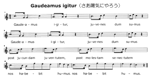 さあ陽気にやろう 僕らが若い間に 憂いのない青春時代を経て 暗い老年時代を経て 僕たちは大地に帰るのだから 健在なれ大学よ 健在なれ教授よ 健在なれ朋友よ 健在なれ同友よ 永遠に花と栄えるように! 麗しく可愛い乙女子よ 健在なれ 精励なる婦人たちよ 健在なれ たおやかで 愛らしく 心根も優しく 誠実であれ! 国家よ それを司る者よ 健在なれ 町よ 健在なれ われらを守る愛と保護の庇護者よ 健在なれ! (宇野 道義訳) |