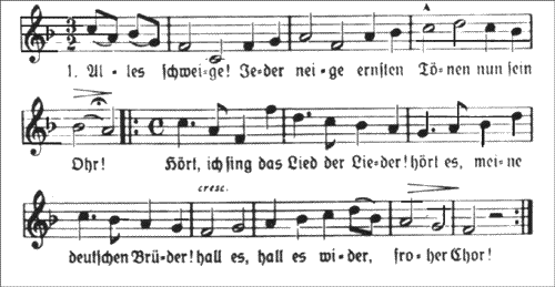 | Alles schweige! Jeder neige ersten Tonen nun sein Ohr! Hort, ich sing das Lied der Lieder! Hort es, meine Deutshen Bruder! Hall es wieder, froher Chor! Hab und Leben dir zu geben, sind wir allesamt bereit; Sterben gern zu jeder Stunde, achten nicht der Todeswunde, wenn das Vaterland gebeut. |