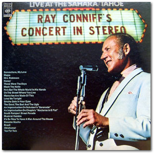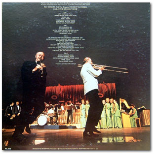 この2-on-1、2枚の別々のアルバムではなく、2枚組の形で出ていたライブアルバムにも適用されます。LPの時代には4面を使っていたのですから、途中で3回プレーヤーのところへ行ってレコードを裏返したりしなければならなかったものが、何もしなくても最後まで演奏されてしまうのですから、これはたまりません(実は、クラシック・ファンはすでにオペラに於いて同じような体験を味わっていたのでした)。最初にご紹介したレイ・コニフの2-on-1の中にも、このライブアルバムがあります。それの元のLPが幸い手元にあったので、それと比較してみましょうか。左が表、右が裏です。