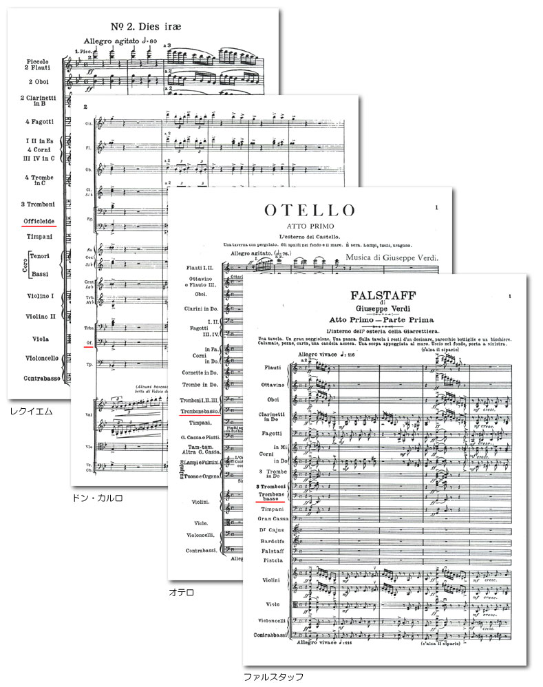 ところで、少しややこしい話なのですが、「チンバッソ」というのは厳密に言えば、この楽器の名称ではないのです。ヴェルディの場合、1874年に作られた「レクイエム」や、1884年の「ドン・カルロ(イタリア語版)」では、このパートに「Officleide(オフィクレイド)」という表記があります。さらに「オテロ」(1887年)、「ファルスタッフ」(1893年)といった後期の作品では「Trombone basso(バストロンボーン)」となっていますよ。