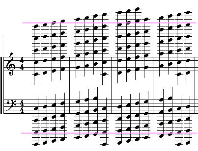 つまり、9オクターブから10オクターブにわたるユニゾンで、音階を鳴らしているだけなのです。そうすると、パソコンの再生範囲などは、ピンクのラインよりもずっと内側でしょうから、さっきのバッハの場合のように常に音階は上へ向かっているように聴こえるというわけです。