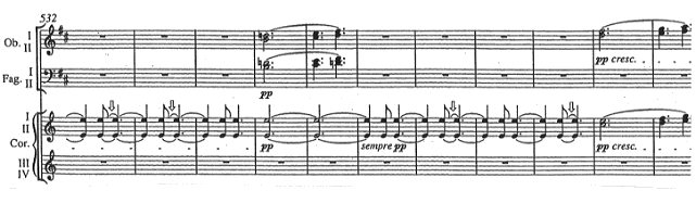生演奏やテレビのON AIRによってこの版に接した人は、この版の「売り」である第4楽章のHrのタイを聴いてさぞびっくりしたことでしょう。現物の楽譜はこんなふうになっています。