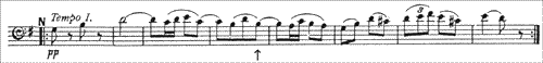 全音版のスコアでは三十二分音符になっています。念のため参照した「プラハ版」でも、同じく三十二分音符です。もちろん、KALMUS版のパート譜も三十二分音符。もっと言えば、かなり初期の印刷譜が種本になっていると思われるドーヴァー版でも三十二分音符。ところが、アーノンクールはバイノン嬢にここを三連符で吹かせているのです。(譜例参照)