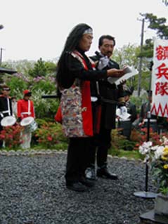 | 本当は先に中島三郎助親子最後之地碑の碑前祭があるのですが、参加できませんでした(汗)写真は、碧血碑の碑前祭に向かう榎本武揚さんと松平太郎さんです。 |