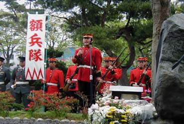 | 碑前祭の様子です。この後、献花や詩吟を吟じたりします。献花では一般の人にも花が渡されて、私も献花してきました(笑) | 額兵隊による礼砲です。手前の自衛官さん達に阻まれ(笑)中途半端な写真になってしまいました。 | ||