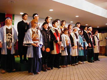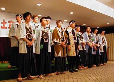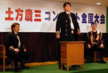 | 土方歳三コンテスト全国大会 いつもは屋外で行なわれるのですが、この年は雨のため五稜郭タワー内で行なわれました。流石に参加者が多いため、全員の写真をお見せ出来ないので、印象に残った方たちを載せてみました。 因みに今回のシナリオは、蝦夷共和国で行なわれた選挙後の演説を歳三が行なうというものです。 |