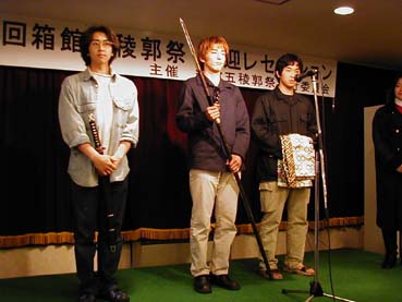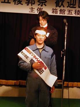 | この方も「天然物」の方です。格好良く登場と思いきや、何故か榎本さんと大鳥さんの仲人をはじめてしまうのでした。 | あまり大きく撮れませんでしたが、この方が優勝者の方です。誠の旗を携えた、正統派の歳さんでした。 | |