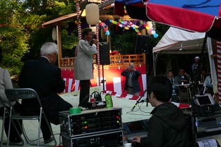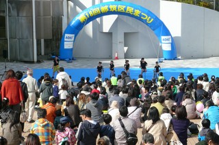 | スキップ広場野外ステージ | ステージも大混雑 | 恒例の各町内の囃子連中 |