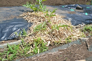 藁は高価で大量に敷くのは大変です。そこでいつもは草刈り機で刈りっ放しのススキを、鎌で根本から手で丁寧に刈って