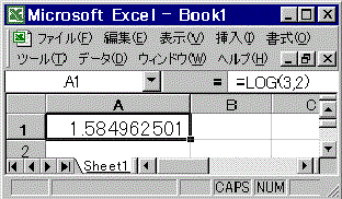 表計算には対数を計算する関数が用意されている。例えばエクセルではLOG(値, 底)が用意されており、セルに[=LOG(3,2)]と記入すれば を計算してくれる。