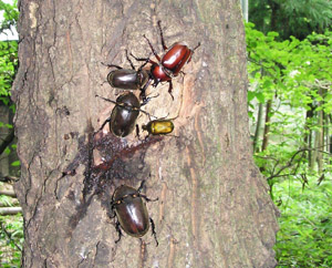 カブトムシといっしょに樹液を吸う○○○蝶 (種類がイマイチわからん!) その他いろんな蝶が飛び回っているが写真撮影は ホント難しい! 住宅地そばのクヌギの木には、人目もはばからず カブトムシたちが樹液をなめている。 その近くのクヌギではミヤマのメスが隙をうかがっている。 夏もあと一ヶ月ちょっと・・・・、あと何日出歩けるかな・・。 |