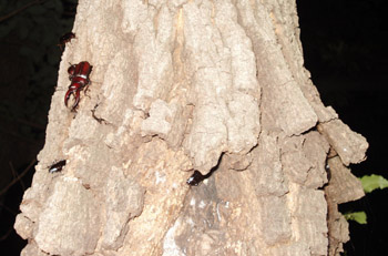 ちょうどモミの木から樹液がでている。出始めは白くないようだ。 これだけ出ていても臭いがない。 シミチョロクヌギの方が圧倒的に昆虫が集まってくる。 ホントにモミに昆虫はくるのだろうか・・・・。 メクレクヌギにノコギリのペア。この木でノコを見たのははじめてだ。 いつもはミヤマなのだが・・・。 |
