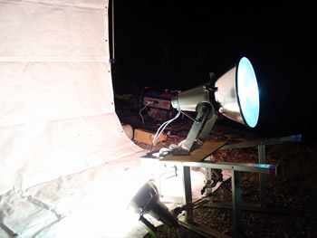 ちょっと県道を走るだけでも道沿いにデコボコクヌギがある。 あまりにも凄かったのでちょっと車を停めて見てみた。 「昼間でもカブトムシはいますね」と。 これだけ道沿いで目立てばたぶん地元有名ポイントでしょう。 とにかく灯火ができそうな所を探して走り回る。 「なかなか良いところないですねぇ〜」 日も暮れなんとか場所をみつけ灯火を張る準備をはじめる。 |