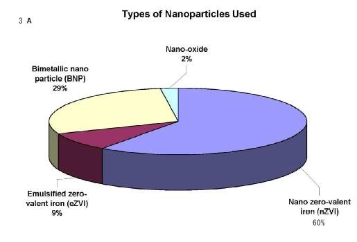 ナノ修復手法は、汚染物質の変換と解毒のために活性ナノ物質の適用を伴う。これらのナノ物質は当該汚染物質を緩和するために化学的還元と触媒作用を可能とする特性を持つ。ナノ物質の原位置修復では、地下水は地上での処理のためにポンプでくみ上げる必要はなく、土壌は処理と処分のために他の場所に移送する必要はない(Otto et al. 2008)。 ナノ物質は、原位置修復にとって非常に望ましい特性を持っている。微細なサイズと革新的な表面コーティングのために、ナノ粒子は地表下の小さな空間に浸透し、地下水中に浮遊し、粒子は大きなサイズの粒子よりも遠くまで移動し、広範な分散を達成することができる。しかし、実際には、修復に使用されている現在のナノ物質は、その注入地点から非常に遠くまで移動するというわけではない(Tratnyek and Johnson 2006)。 ナノスケール・ゼオライト、酸化金属、カーボン・ナノチューブ及びファイバー、酵素、様々な貴金属(主にバイメタルナノ粒子)、及び二酸化チタンのような多くの異なるナノスケール物質が修復用に調査されてきた。これらの中で、ゼロ価鉄(nZVI)が現在、最も広く使用されている。 補足資料、表1は、潜在的な修復対象である汚染物質とともに異なるナノ物質をリストしている。補足資料、表1に示され、修復に用いられている様々なナノテクノロジー・アプリケーションの化学及び工学、な包括的概要については Theron et al. 2008 及び Zhang 2003 を参照のこと。この論文では、ゼロ価鉄(nZVI)及びその地下水修復での使用に焦点を当てる。 ナノスケールのゼロ価鉄 ナノスケール・ゼロ価鉄粒子は径が10〜100nmの範囲にあるが、供給者のあるものは、”ナノ粒子”としてマイクロメーター・スケールの鉄粉を売ることがある。典型的には二番目の貴金属(例えば、パラジウム、銀、銅)が触媒として添加される。この二番目の金属は、それ自身と鉄の間の触媒の相乗効果を作り出し、また、地中に注入されるとナノ粒子の分散と移動を助ける(U.S. EPA 2008b; Saleh, 2007; Tratnyek, 2006)。 これらのバイメタルナノ粒子(BNPs)は、二種以上の異なる金属を含むかもしれない。二番目の金属は通常、活性度が低く鉄の酸化又は電子移動を促進すると信じられている((U.S. EPA 2008b)。貴金属のあるもの、特にパラジウムは、脱塩素及び水素添加を促進し修復をより効率的にする(U.S. EPA 2008b; Zhang, 2006)。 環境汚染物質(特に塩化溶剤)と鉄との反応化学は広範に研究されており、マイクロスケール・ゼロ価鉄浸透性反応バリアに適用されている(Matheson and Tratnyek 1994)。塩化溶剤には二つの主要な分解経路、ベータ脱離と塩素還元がある。ベータ脱離は汚染物質が鉄粒子と直接接触する時に、しばしば起きる。下記例はトリクロロエチレン(TCE)の経路を示す。 TCE + Fe0 → HC products + Cl- +Fe2+/Fe3+. 地下水中のゼロ価鉄によって促進された還元条件下では下記の反応が生じる(U.S. EPA, 2008b)。 PCE → TCE → DCE→ VC → ethene (以下省略) 実施状況 ゼロ価鉄の実際の適用数は急速に増大している。プロジェクトのほんの一部だけが報告されており、新たなプロジェクトが定期的に出現している。Figure 2及び補足資料Table 2 はナノ修復手法が現場修復のためにテストされた45の現場をリストしている。これらの現場はアメリカを含んで7カ国(訳注:アメリカ、スロバキア共和国、チェコ共和国、ドイツ、イタリア、カナダ、台湾)に及んでおり、アメリカでは17州にある。全ての現場は、PCE(テトラクロロエチレン)、TCE(トリクロロエチレン)、PCB(ポリ塩化ビフェニル)のような何らかの塩素化合物と関連している。他の汚染物質は六価クロム及び硝酸塩である。 この技術は、現場修復のための現行の実施方法の有益な代替のようであるが、潜在的なリスクはほとんどわかっていない。生態系に影響を与える要素とプロセスは複雑であり、環境中の工業的ナノ粒子のヒト健康に及ぼす潜在的な影響の知識はいまだ限定されている。ほとんどの社会的論点は現場修復のためにナノスケール物質を使用することによる未知のリスクに基づいている。現場は、油田、工場、軍事施設、個人所有地及び住宅地である。 Figure 3A は現場で修復に使用されている工業的ナノ粒子のタイプを示す。3分の2以上の現場はゼロ価鉄で処理されており、バイメタルナノ物質の大部分は鉄を含んでいる。Figure 3B は、これらの現場で処理される媒体のタイプを示す。4分の3以上の処理現場は汚染された地下水を含んでいる。 潜在的な影響