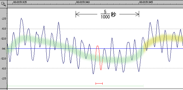 | 音質が良いものと悪いものの違いは何であろうか? それがフォーマットである。 以下はちょっと難しい話になるので、分からない人は「44.1kHz、16ビット、ステレオ」と覚えておけば良い。これが現在最も一般的に用いられているフォーマットの形式だから。 音の正体は「波」である。 この「波」の変位がある瞬間にどこにあるか、それを記録したものがCDなどの、記憶メディアなのだ。 上の図はある曲の「波」を表したもので、横軸が時間、縦軸が変位(音の強さ)である。 図の赤色の部分を1周期といい、この場合赤い部分は約1万分の6秒で、1800Hzの音となり、 緑色の部分は約100分の1秒、100Hzの音である。 デジタルで録音する場合、t秒おきの波の高さを記録して、それを滑らかな線で結んで波とする。 例えばCDの場合は44100分の1秒おきのデータを記録しているので、これを「サンプリング周波数44.1kHz」という。もちろんサンプリング周波数は大きい方が、元の(生楽器などの)音をより正確に表すことができるので、音が良い。 さて、波の高さ(強さ)を何段階で表すかも大切で、CDの場合は2の16乗=65536段階の強さで表している。こちらはビットレートといい、「16ビット」と呼ばれている。当然ビットレートも高い方が音が良い。 |