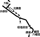八幡宮から北鎌倉に抜ける道にある坂で、鎌倉七切り通しの一つです。この坂より少し大船寄りに、小袋谷(こぶくろや)という地域があります。小袋谷は昔「巨福礼(こぶくろ)」とか「小福礼」と書かれ、現在よりも広い地域のことを指していたようです。とにかく、大船から鎌倉に向かってドライブすると、小袋谷を抜けて巨福呂坂を通ることになります。まぎらわしいですね。 | |