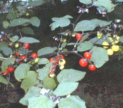 ナスの葉を持ちながら、径2cm程度の赤い実とやがて赤くなるであろう黄色の実を付けた植物がありました。