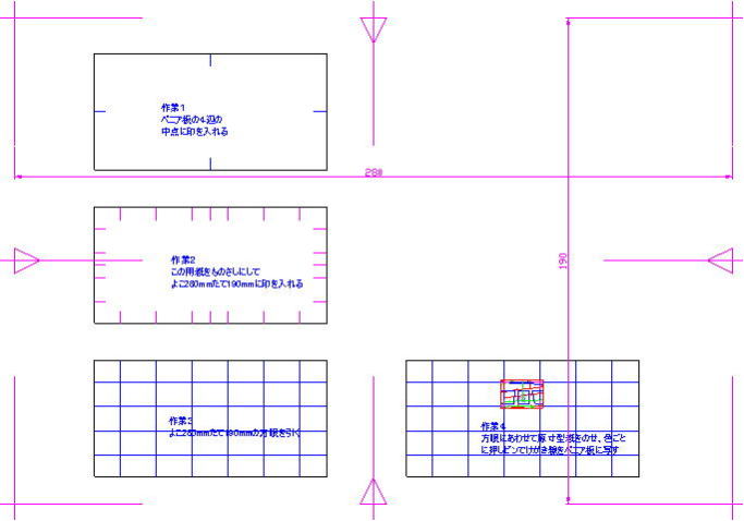 まず、ベニア板に、よこ280mm間隔、たて190mm間隔でマス目を引いておきます。