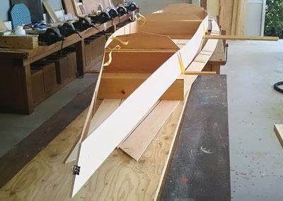 | 隔壁と、側板の接合をします。側板につけた位置決め板をガイドに隔壁を固定。 前後は、クリップで仮止め状態。 さらに、左右底板を接合しておきます。(実艇の場合は、不要) 最前、最後の隔壁は、あとで組み立てます。 |