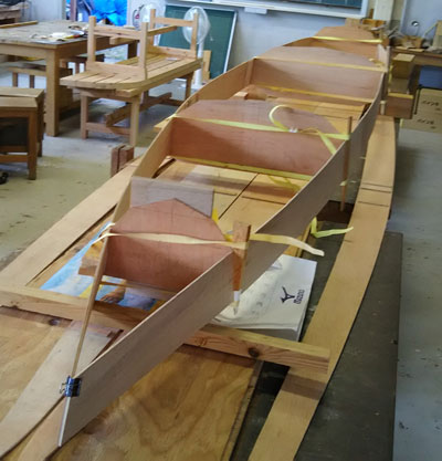 | 隔壁を接着しました。久しぶりの作業です。 バンドのかけ方は、隔壁が密着するように工夫しています。 バンドを締めすぎるとベニアが変形します。あて板やくさびを活用します。 5枚の隔壁をここで接着しておきます。 |