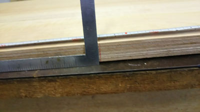 | 底板も組み立てて、接着します。このとき、船体の中央ラインに隔壁の中心線がきていることを確認します。 また、隔壁の最上部が平行になっているか、すなわち、船体にねじれがないかを確認して接着します。 側板上部に渡した横棒が、平行になっているかで、ねじれが確認できます。 |