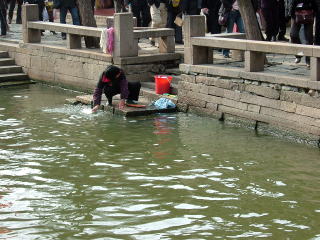 観光舟が運河を行き来する。その横ではひしめく観光客を尻目に洗濯する女性が。