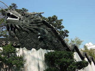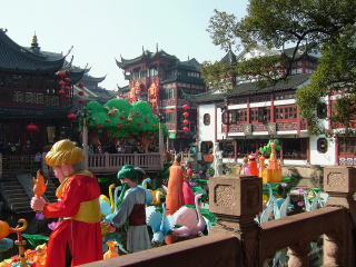 (右)正月用の人形や動物のデコレーションで飾り立てられた豫園内部。