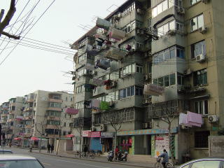 (右)アパートの窓から突き出されているのは布団や洗濯物だ。
