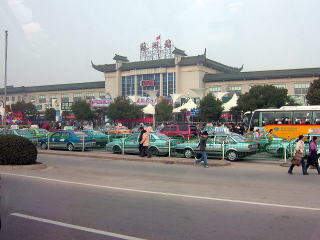 (左)正月休みを終えた人たちでごった返していた蘇州駅前。地方に帰るバスはすべて満員の乗客だった。