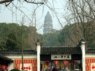 (右)中国のピサの斜塔と言われる虎丘の呉王墓陵。そういえば傾いているような。