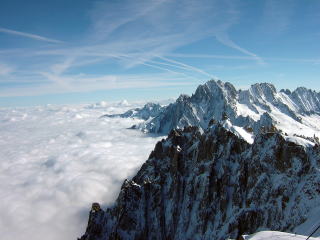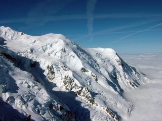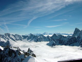 「空気が薄いですから、興奮して走り回ったり、はしゃいだりしないようにして下さいね。またウチの鍵をかけ忘れたとか、ガスの元栓きったかしら・・なんて思い出さないでください。高山病になった場合どんどん悪くなりますからね」と心温まるご忠告を胸に展望台(エギーユドゥミディ)に立つと、目の前にモンブラン、青い空には右へ左へ飛行機雲。やはり写真でみるのとは違って、自然の雄大さに心が躍るし息も詰まる。←空気が薄いため。