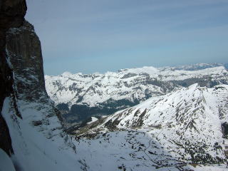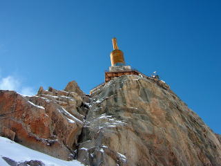 ケーブルカーは現地人(かどうか顔ではわからないが)スキーヤーで満員。みな完全スキー装備なのだが、この急な高地をどう滑り降りるのかしらん、と心配するほどの高さまで上りつめ、ついには岩肌にベッタとぶつかった。「えっ!?降りるとこがないじゃん!」と思いきや、ぐんぐんぐぅぅんと持ち上げられて、駅????に到着。やれやれ着いたと思ったら、鉄砲玉風の塔が建っている頂上までエスカレーターでぎゅ〜んと連れて行かれ、ここが何と標高3842bだと。富士山より高〜いのだ。 因みにそこから臨むモンブランは4807bだと。