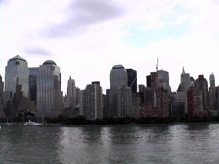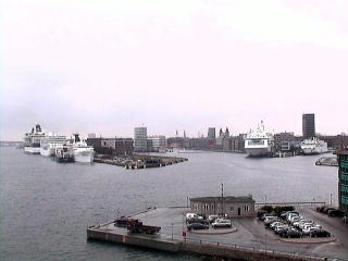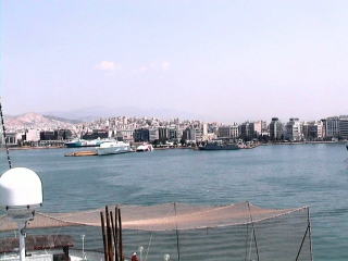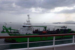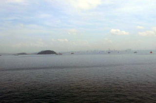 朝デッキに出たら遠くにかすむパナマ市内が見えました 機材を積んだ船が忙しく行き来してました