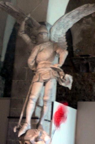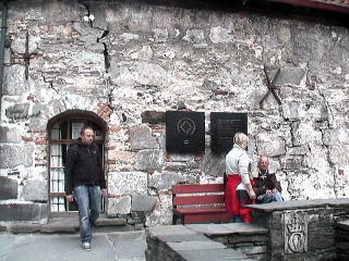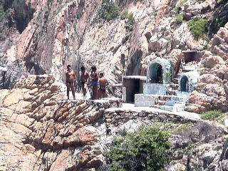 (左)右側の祠は飛び込む前に安全を祈ります 波の高さを見ていてタイミングを計るのか演技なのか判りませんがなかなか飛び込みません