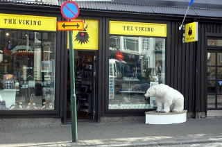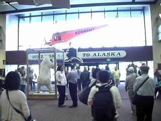 ↑アラスカアンカレッジ空港大きな白熊の剥製が出迎えます