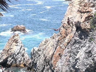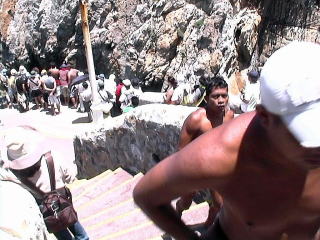 (左)飛び込みが終わり上がってきたところです 収入は観光客の人数に応じた歩合と観客に貰うチップで保険は当然入れないそうです。