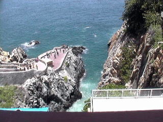 (右)飛び込む瞬間を見ようとすると観客が多く水しぶきしか見えませんのでレストラン側から見た着水地点です