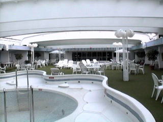 全天候プールです。雨が降ると屋根が移動します。明日はプール開きを行います。ちなみに水は海水です。