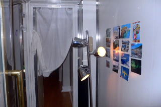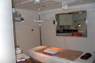 隣の船室の人が鏡のついたローッカーの扉を開けたら約20キロはあろうかと思われる扉が足下にドカ!!と落ちて危うく足を潰されそうになったそうです。