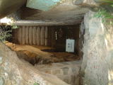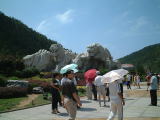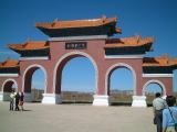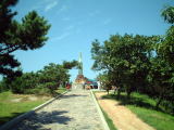 203高地も日露戦争の遺跡で、教科書にも出でくる日露軍激戦の地である。バスは山の中腹の駐車場で止まり、そこからは徒歩で登るのであるが、駐車場周辺には観光客目当ての駕籠屋がひしめき、日本語を交えながら「往復20元でいいよ」としきりに客ひきをしている。結局、その誘いにはのらず記念碑の建つ頂上へ。頂上には砲弾をかたどった記念碑がそびえ建ち、周辺は観光客でにぎわっていたし、さすがにここには土産物屋も軒を連ね、観光のメッカである片鱗を覗かせていた。また、快晴のためそこからは旅順口が一望でき、湾入口の狭さを目視したが、まだ立ち入りを許されない砲台跡が各所にあるとか。