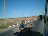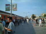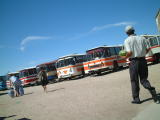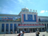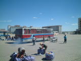 快晴の満州里、まぶしいばかりの駅前にはすでに迎えのバスが到着しており、我々はまずホテルへ直行。まずはシャワーでもということで休憩をとったが、荷物の入れ替え作業等でシャワーどころではなく、直ぐに出発時間となりロビーに集合。入口にはモンゴル衣装を着たスタイルの良い女性のドアマンがいて、恰好の写真のモデルとなっていたが、目の前の公園では折良く結婚式を迎えたカップルが家族に囲まれており、一度バスに乗り込んだ同行者は再びバスを下りてカメラ片手に彼らを撮影するために走った。カップルを乗せてきた真っ赤なオープンカーには「新新娘」と横書きしてあり、いかにもそれらしい車だったが、どうやらこの「新新娘」は結婚式企画会社の商号のようであった。要するに我々が宿泊するホテルは当地では一流で、上流階層の結婚式場として利用されているようなのだった。バスは一路、中露国境へ向かったが、その道のりはかなりの悪路の連続で、車は飛びはね続け、ついには土砂に乗り上げて動かなくなり全員が下車。車体がめり込んだ土を掘り起こす等してまた走り出す騒ぎ。車窓からの風景は炭坑の街を写しだし、窓から入る臭いも特有なものであった。時折道路を走るロバ車を追い越し、公安の車に追い抜かれ、とバスは数十qを走り抜き、やがて国境にある貿易市場に到着。ここはロシア人が国境を越えて物資の買い出しにくるという市場で、ロシア人が多く、それぞれが大人ほどもある巨大な荷物を持っている。彼らはやがて荷物をバスに詰め込み、そして灼熱の太陽が照りつける中、バスの隊列は砂塵を巻き上げで市場を後にしていった。その一斉の行動は実に統制的であった。