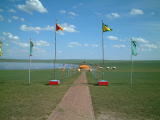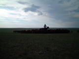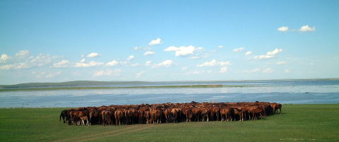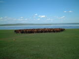 我々が泊まるパオ(テント)は中央にレストラン棟があり、そこから見て左右に5棟づつ計10棟、離れてイベント小屋が1棟、裏に従業員用の棟が1棟建てられている。各棟とも赤、青、黄色の色で彩られ、通路はコンクリートでなぞられているなど、観光客を意識した造りだ。パオは本来遊牧民の住居で放牧しながら移動するのであるが、ここは観光用の、いわばホテル仕様なのだから移動はしない。我々が入ったパオの中はベットがコの字型に三台あり、床はコンクリートで塗られていたが、他のパオは床が地面のままであったり、板敷きのものもあったと聞く。扉を閉めてみると、傾いていてピタリとは閉まらず、両脇に窓がついていて、カバーを開けると風通しは良かったが、虫が入り込む。ベットの上に荷物を整理し、外へ出て見るとパオの前は広大な草原と地平線が広がり、緩やかな下りの向こうには湖が緑を写していた。その湖のほとりに裸馬の一群が輪を作って佇んでいるのが目に飛び込んでくる。数百頭ものその一群は全てが中心に頭を向け、外敵から身を守っているようでもあり、皆で何か相談しているようでもあった。その近くに一頭の馬を連れた遊牧民がいて、同行者が話しかけると人の良さそうなそのおじさんは草の上に腰掛けながら話に応じてくれた。私の持っていたタバコを一箱プレゼントすると、彼は自分の持っていたタバコを一本差し出したが、これまで友人からもらった中国のタバコはいずれもあまり美味いものでなかった思いから断った。近くにはこれも数百頭の羊が群れていてモンゴルの草原らしさが身近に現出していた。