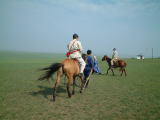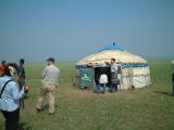 笑いに包まれた我々のバスは草原の風をいっぱいに受け入れて走り、やがてポツンと現れた本物のパオへ向かった。ところがこのパオはあいにくの留守。恐らく放牧にいったのだろうから待っていても帰っては来ないと判断して別のパオを探して再び走るが見渡す限りなにもそれらしきものはない。暫くしてもう一件のパオが現れたが、さっきのパオから10q程度はあろうか。これが隣なのである。近づいてみると丁度馬に跨った住民がパオに戻る光景が見え、これなら間違いないとそのパオを訪問することにした。