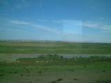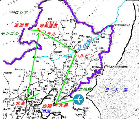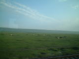 途中幾つかの駅に停車して、真夜中だというのに降客がホームを歩いている風景をカーテンの隙間から眺めていたが、下で寝ていた妻が窓から明かりが入りまぶしいと苦情を言い出し、それも諦めてウトウトするうちに、白々と夜が明けるのが分かり、再びカーテンの隙間から外を見るとそこはすでに広大な平原の中であった。早朝に大興安嶺を超えたのだ。朝だ、トイレだ、歯磨きだと皆が動き出し、カーテンも開け放されて快適な列車の旅が続く中、草原のあちこちには羊の群や牛・馬の集団が見受けられ、また遙か彼方に街もあって飽きない風景が車窓に展開し、異境の地にとうとう来たという感慨が溢れる。この頃隣りの部屋では同じ部屋にいた中国人のおばあさんが同行者に朝の体操を伝授。脈のある場所を32回づつ打ち付けるのだと7種類の技を披露して、これが隣りへ隣りへと伝達され、あちこちでぴしゃぴしゃと手を打ち鳴らす音が響き渡り、小さな日中友好の輪が出来上がった。朝飯は食堂車でとり、そうこうしているうちに9時56分満州里の駅についた。実に13時間の列車の旅であった。