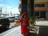 我々は約55qの道のりを再びハイラルの道を走りホテルに到着。昼食後シャワーを浴びたり昼寝をしたりしてパオ宿泊の疲れを癒した。ホテルはホロンバイル賓館(ハイラル市勝利大街2号)(0470-8222212 fax0470-8221123)だった。夕刻、市内の民族博物館に見学に行くためロビーに集合することになったが、ここで我々夫婦にトラブルが発生した。一端は準備を整えロビーに行った妻が急に上着を一枚持ってきたいと言いだした。すでに部屋のトランクは入れ替えも終わり厳重に鍵もかけてあるので、それを開けることには時間がかかるので私は渋ったが、どうしてもということで、私も同行して部屋に戻った。カード式の鍵は常に私が管理し保管しているのだが、この時ばかりは妻がカードを手にしてドアを開け、トランクを開けて中の洋服を出し、再びトランクを閉めたて、集合時間も過ぎているから早く戻ろうとしたら鍵がない。取り敢えず可能性のあるところを捜してみたが見つからない。鍵がないと自動ロックの部屋だから戻ったときに入れなくなるということでやむを得ず妻だけ博物館の見学に出し、私は一人部屋に残った。西日がガンガンに入る部屋で暑い中、頭も熱くなってトランクの中をひっくり返して全て確認し、部屋の隅々を見て回ったが無駄骨。そのうち部屋をノックしてホテルの従業員がお茶の交換に来たが、額に熱さまシールを張り、上半身裸の私の姿を見て驚きの表情で部屋のドアを閉めていってしまった。ここまで捜してもないのだからきっと妻のリュックにでも入っているんだろうと推測した私は、気分転換のためデジカメを取り出し、解説書と見比べながら時を過ごした。意外と早く一行は戻ってきて、妻に聞いてみるとバスの中でも調べて見たが部屋のどこかにあるはずだ、と言う。いや部屋には無かったと私は言い、もう一度推測すると、部屋を開け、トランクの上に鍵を置いて、そのままトランクを開けたため向こう側に滑り落ちたのではないかと妻が言いだし、トランクを下に降ろして調べたが壁に張り付いて木製のトランク置き場あるだけ。この作りでどこかに落ちるはずはないと思ったが念のため横から覗いてみと、なんとそこにカードが引っかかっているではないか。つまり、壁板と台とのほんの1o程度の隙間からカードはトランク置き場の向こう側に滑り落ちたのだった。この神業的出来事に思わず顔を見合わせて笑ってしまったが、ともかく一件落着であった。