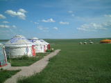 9時30分に満州里を出た列車は予定通り12時25分にハイラル着。昼食後すでに到着していたバスに乗り込み、約55q離れた草原に向かった。道路は舗装されていたが、見渡す限りの風景は草原、また草原で羊や馬の群が散見されるだけ。ガイドの白さんは依然として独特のユーモアで我々を笑わせながら、賑やかなドライブが続き、やがて遙か彼方の丘の上に幾つかの小さな建造物が姿を現し、あれが今晩の宿だ。